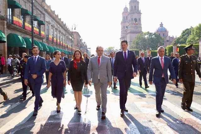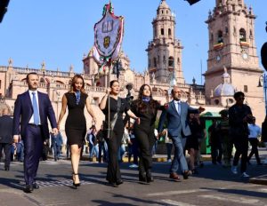 Ante la fachada del Palacio Municipal de Morelia, el acto dio inicio al rendir honores a la bandera, develar la cartelera y arrancar al recorrido por las calles del centro histórico.